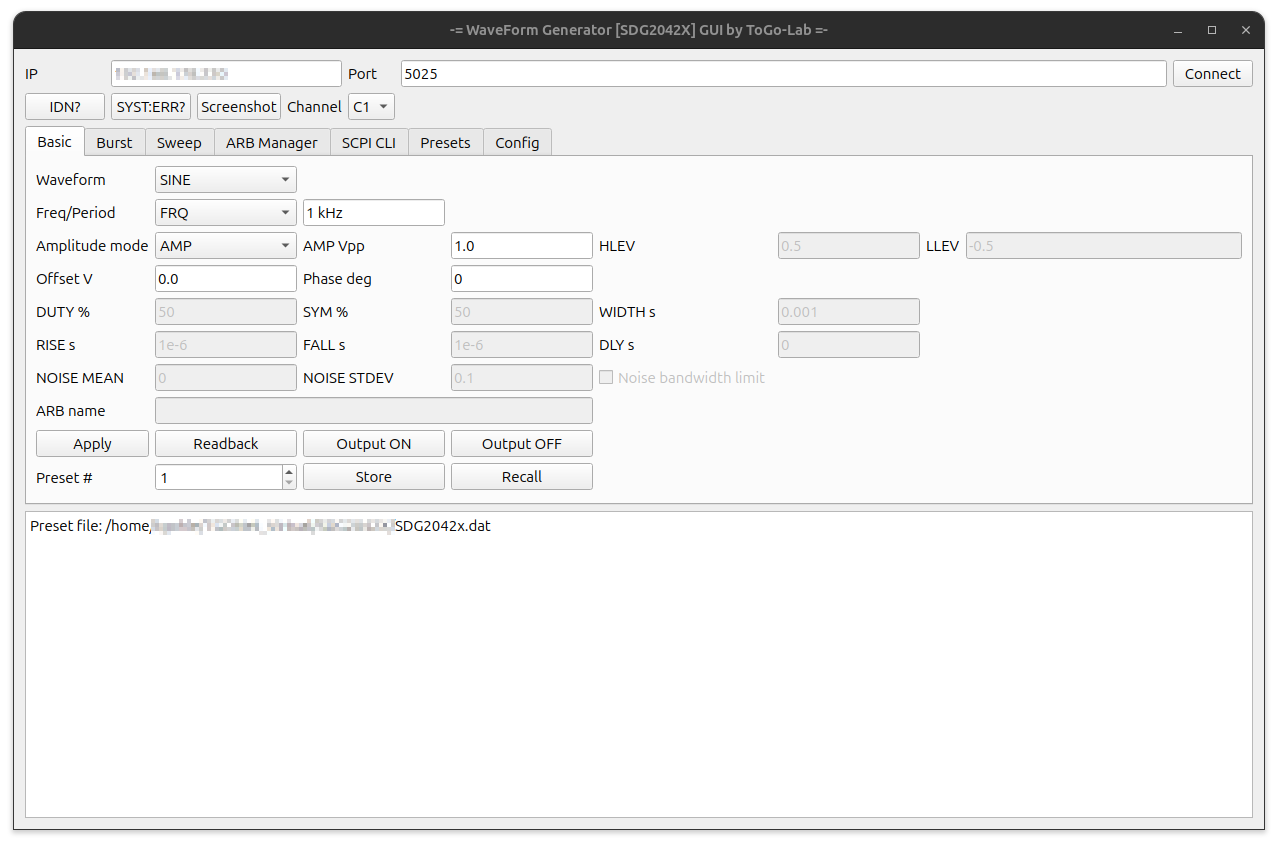 The program talks to the SDG2042X over a simple socket connection on port 5025 using SCPI commands. You can call the script with the -ip parameter (try also --help). This is handy if you launch it via a .desktop file.